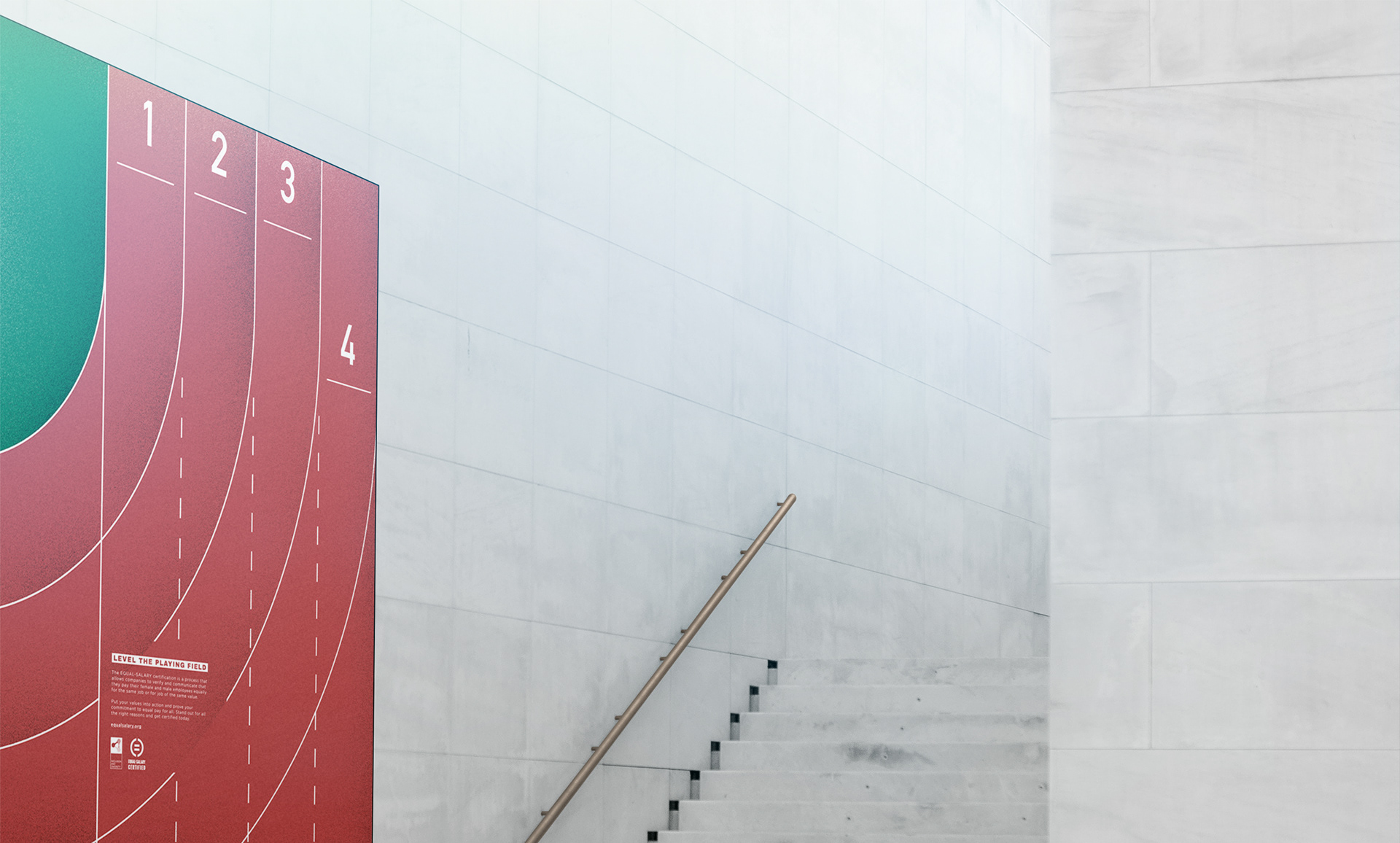 A series of indoor posters to communicate the company's commitment to challenge the gender pay gap. The posters visually dramatise the inequality through metaphor by drawing comparison to equal playing fields.